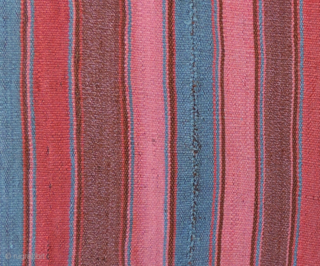 Aymara Mantle, (wallas) Lake Titicaca Region of Peru or Boilvia. Mid 19th century or before. 48 x 45.5 inches. Mantles such this are known for their fine weave and colorful warp striping. This example has very good color and condition. The blues are luminous. Notice the lilac and soft brown colored bi-chrome alpaca yarns in detail. The handle of this weaving is thin and very supple. See in San Francisco this week if you are in town.