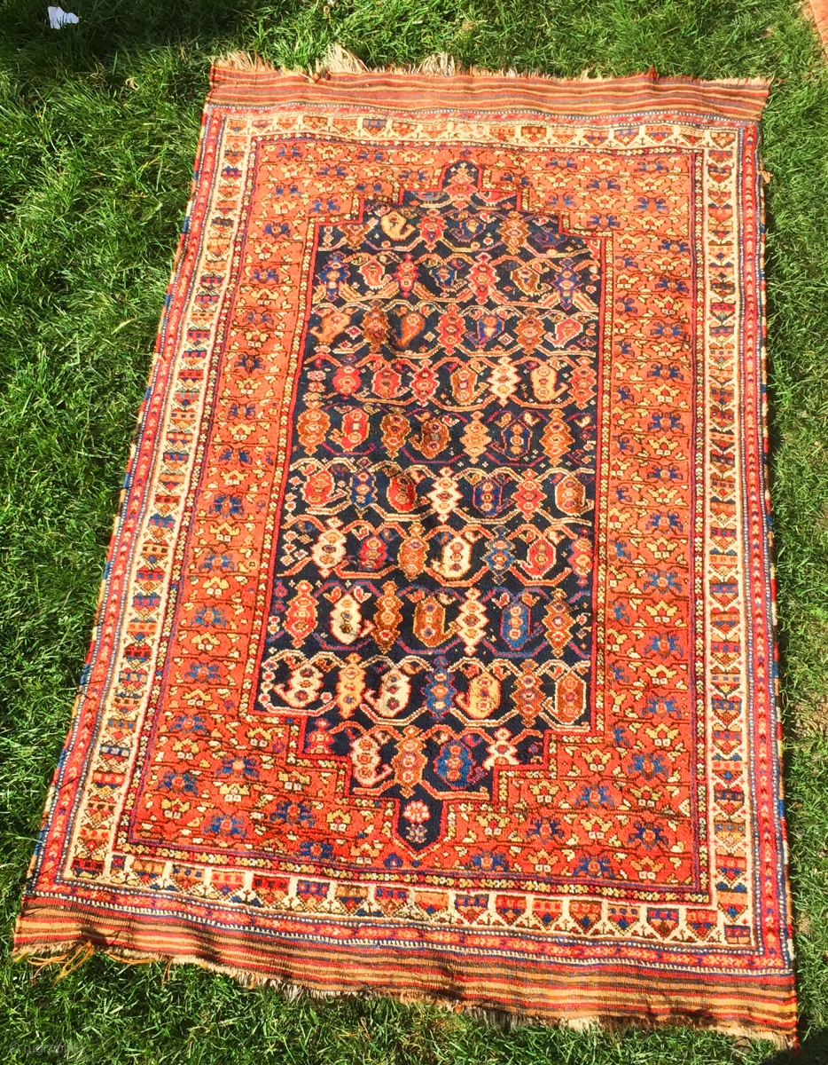 Nice full pile Afshar, 3'10" x 6'3". 19th Century, all good colors. Since last appearing in these pages this piece has been washed, two slight crease wears have been expertly repaired, and about 2' of selvedge touched up. Otherwise no restoration.