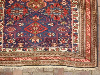 Kuba-- 4 ft 4 inches x 9 ft 0 inches. No anilines (as far as i can tell). Circa turn of the century? Some sew up repairs upper right corner. I’m guessing bail hook tears. i showed both sides in this area. Aside from this the rug is in terrific condition. Good pile, little or no wear; Original sides and ends are in nice shape. $30 ups shipping to lower 48.