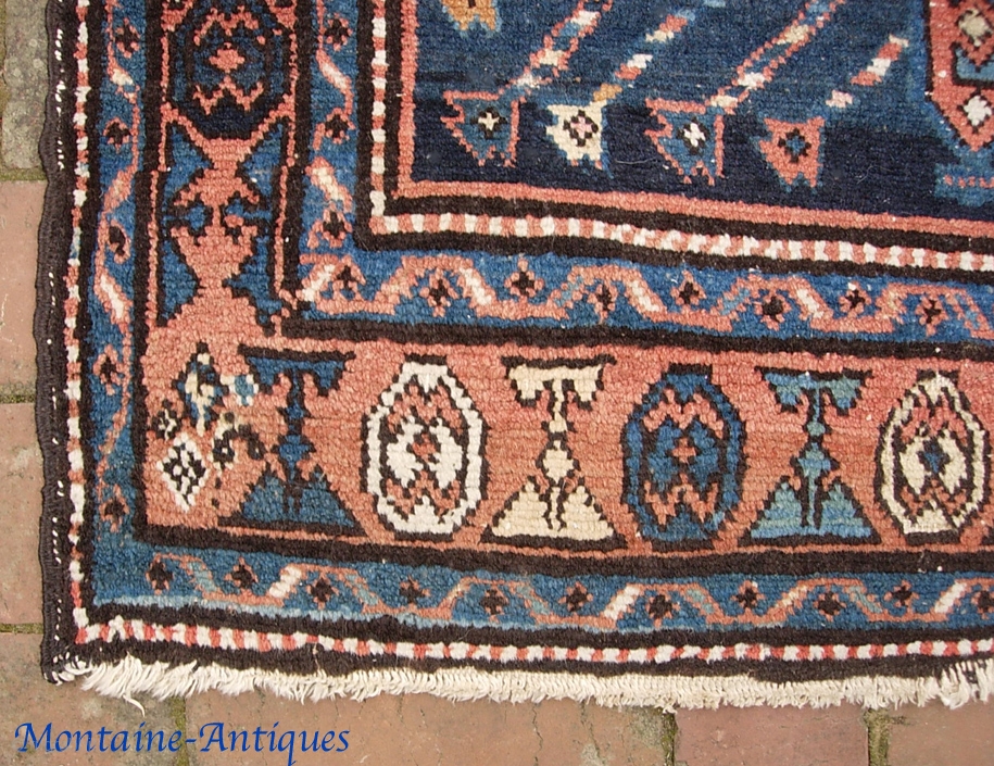 nw-- 2 ft 10 inches x 4 ft 8 inches. a little indigo Serapi. Cool thing. Even pile with a smattering of foundation dots here and there. Sides and ends are close to being intact. Pictures tell the story $20 ups shipping to lower 48.