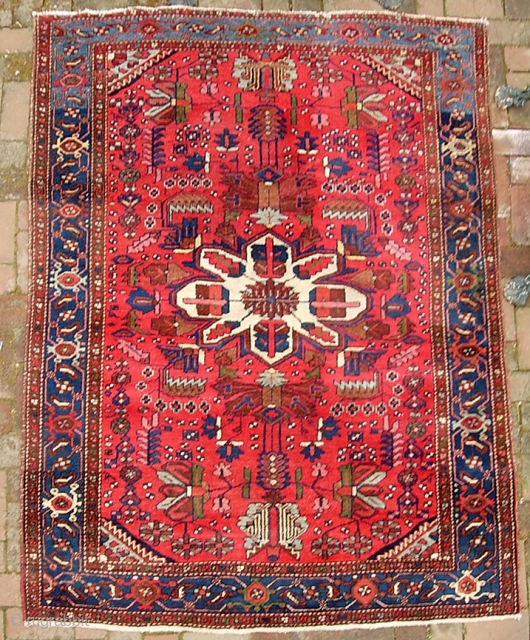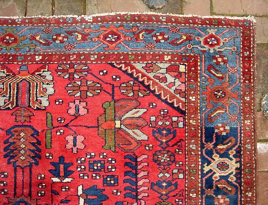 Hamadan-- 4 ft 10 inches x 6 ft 6 inches. Really good one. Maybe an older Zagheh(?). Its like Cherry Vess (remember that stuff?). Intense as this red is i think its definitely natural. All the other colors are right-on. Really good quality wool. Hugely decorative and splashy piece. a bit of attrition just commencing on the unbraided end. Aside from that the rug has good pile throughout; original sides and end braiding. $25 ups shipping to lower 48.