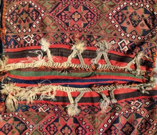 Antique Malatya heybe, early 20th century, unusual for the use of gold metal wrapped thread, together with white cotton and wool, beautiful green used lavishly. a large example, at 2'8" by 5'8". a couple of old ethnographic repairs on the back, as seen in the last photo. Please ask for additional photos if needed.