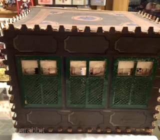 The entirely hand-made contents of the house include; a Syrian couple in period Ottoman costume and their baby in a cradle with a black nurse or servant, an upholstered divan in fromt of finely latticed windows with silk curtains, an octagonal inlaid Mishrabiye table, copper trays, shisha pipes, spindles, a brazier, a full length mirror, embroidered wall hangings and a rug, two calligraphies of Syrian proverbs. The house is constructed of three walls, a floor and roof which all slot together with tabs in the manner of a stage set with kutnu silk curtains on the front opening. The exterior of the house is painted in the manner of a konak house, described by Wikipedia as a period Ottoman empire house, especially an official residence.