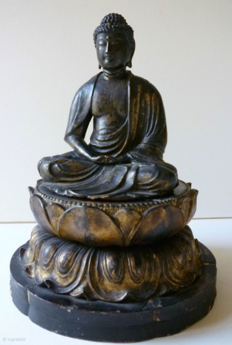 Composed of two sections in joined wood-block construction, this early Edo period Amida Buddha is finely carved in wood, finished in black and gilt lacquer. He is seated on double lotus pedestal with the large round lotus petal base characteristic of early Edo style. He sits in the lotus (Sanskrit padmasana) posture with thumbs joined together in the meditation or contemplation mudra (Sanskrit dhyana). The eyes are inset glass and the forehead is inset with a yellow crystal stone urna (a bindi in Hindu) one of the 32 signs of the Buddha. This Buddha rupa of an unusual size was formerly in a private collection in Brussels and would originally have sat on the shrine altar of a Japanese Zen temple or monastery.