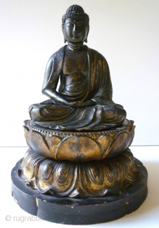 The Buddha rupa is structurally sound with the mandorla missing, with patination and old wear consistent with its considerable age, including small surface lacquer losses, rubbing, cracking and remains of old labels. Overall Height: 27.5cm, width: 21.8cm. Height of Buddha: 17.5cm, width 14.2cm.