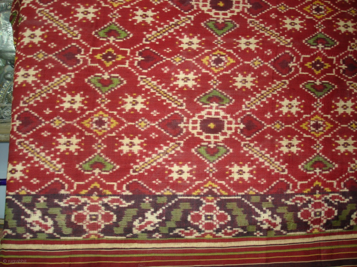 Patola Sari Silk Double ikat.Probably Patan Gujarat.India.19th Century.this Patola sari has the type of geometric,non figurative pattern particularly favoured by the ismaili Muslim merchant community of the Vohras.and its called Vohra-Gaji-Bhat.(Vohra Type Design).Its complex field design of stylized leaves,stars and other motifs is combined with multi-layered and patterns.these include the triangular element called Tumpal.which is particularly associated with South-East-Asian Textiles and with Patola made for export to that area. Its Size is 126cm x 460cm.Condition Is good(DSC02236 New).