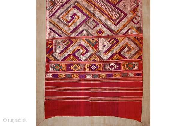 Handwoven and embellished silk on cotton brocade sleeping blanket from Laos. Geometric woven designs with red, purple, green, gold, and ivory brocade.