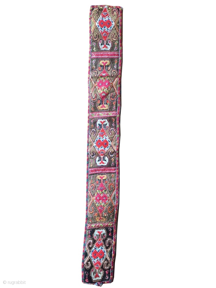 An exceptional antique Uzbek silk cross-stitched belt. It dates to the 3rd quarter of the 19th century. It is very likely attributed to the Shahrisabz region. Many often mistakenly and generically call these Lakai. Either way, it is a great museum quality piece with an outstanding design and brilliant natural colours. The compartmented Rams horn design with ok joy motifs is visually dazzling. Easily the best of its kind. It is backed with a gorgeous silk warped cotton weft Ikat. Mint condition. size: 76cm x 9cm (30" x 3.5"). Email me your questions.