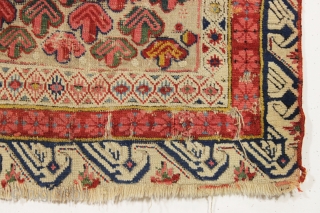antique little seichour rug with astonishing color. a rainbow of natural colors. Almost completely oxidized brown field. Overall rough condition with wear and damage as shown. Slight edge staining from the crude rewrapping. Not recommended for restoration, just enjoyment. Clean. Good age, 3rd qtr. 19th c. 3'1" x 4'7"