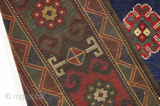 antique large mystery rug with a powerful design. Probably caucasian although certainly not karachopf type as the structure with brown wefting and goat hair selvages are not characteristic kazak. Neither is the overall color palette. There are karachopf kazaks (i owne one) with a remarkaly similiar empty or nearly empty central reserve but they are structurally quite different. i have seen and personally inspected 3 others rugs of this unusual group and they are all very close in design, color and stucture, although varying greatly in size, some being very large, especially in length. None have, in my opinion, been identified correctly. Perhaps more karrabaugh in origin? Or more likely a weaving from a as yet unidentified village? This example is in reasonably good condition with recent wash and restoration. Pile varies from good medium length to some areas of normal wear and lower pile as shown. No holes, tears or damage. All natural colors with a very harmonious palette. An eye catching addition to any home. Good age, ca. 1875. 4'8" x 7'5"