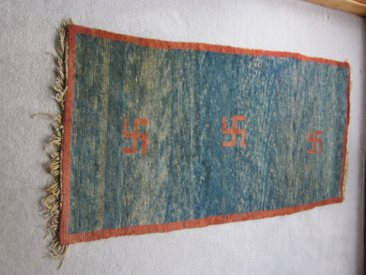 Tibetan khaden, 29 by 55 inches, three red swastikas on abrashed blue ground, natural dyes, pre-1900.