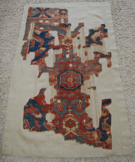 West Anatolian Oushak Rug Fragment – Smyrna Rug. Mounted. Size of support (linen): 116x182cm, fragment size: about 106x172cm.