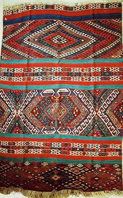East Anatolian Kurd small flatwoven panel, 3.6 x 5.0 feet (107x152 cms); mixed technique with slit-weave, jijim and zili brocading methods; exceptional weaving sampler and brilliant saturated vegetal dyes.