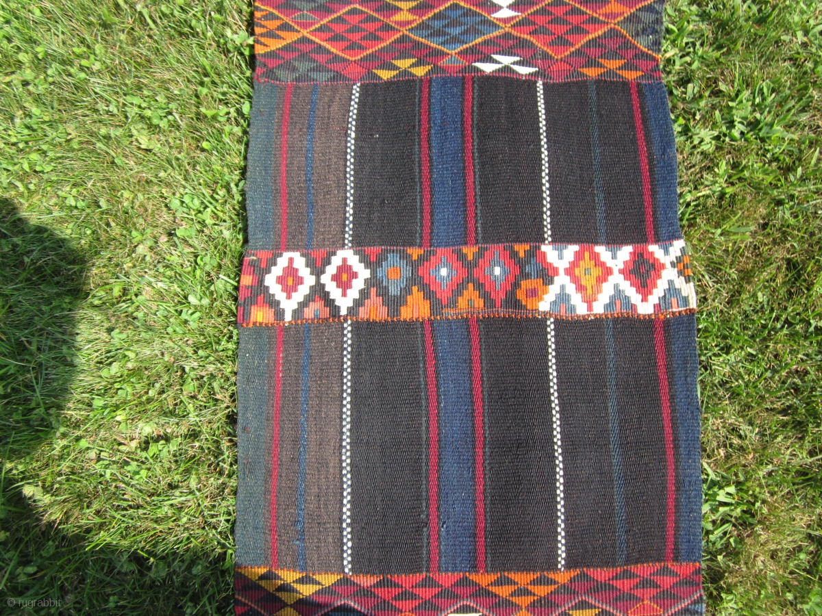 Beduin: Narrow kilim probably made in Jordan on a back strap loom c.1950. Rich colors include some hot dyes. Size: 19 by 162 inches. See last shot for small hole, the only blemish in the piece