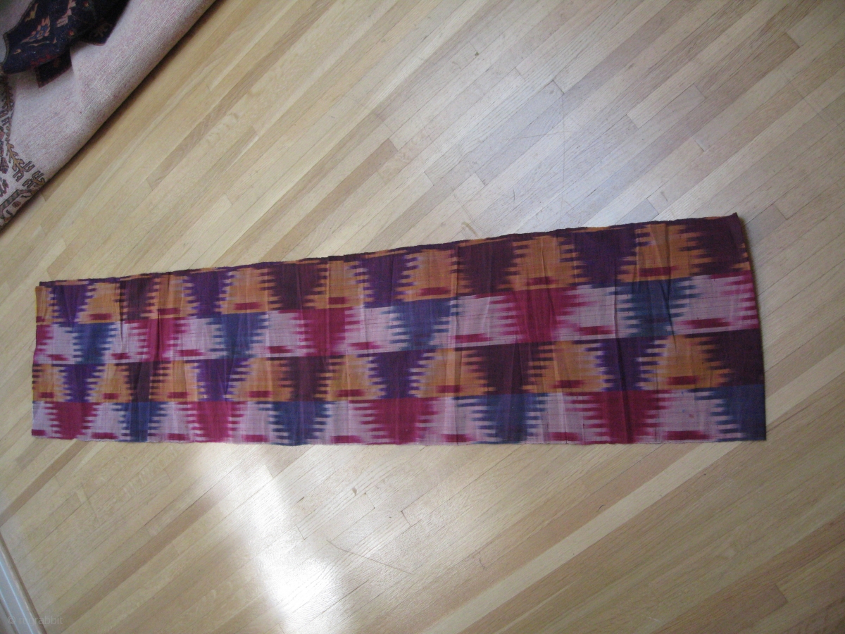 a length of Uzbek Adras Ikat.Late 19th century. Dimensions 15.5x136 inches (39.5 x 346 cm) Five colors ( White, yellow, red, purple and blue )Although this is a rather common Uzbek pattern this item is unusual in that despite its age it has never seen the light of day and is in absolutely mint condition.