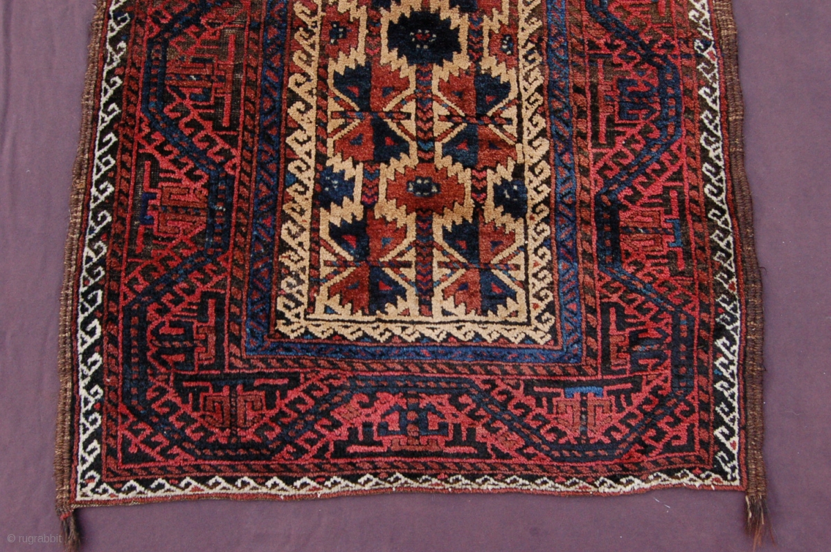 Meaty camelground tribal Baluch rug 134 x 93 cm (4ft 10" x 3ft 1") last quarter 19th century. All natural dyestuffs, colours: red, dark blue, blueish green, camel, brown, dark brown (some corrosion, see pics), white. Condition: good, full to medium pile all over, original selvedges complete and intact, original kilim skirts reduced and turned over (secured). Technicals: asymmetrical knotting, warps ivory wool, wefts: 2 shoots of fine brown wool, pile: exquisitely soft and shiny wool (all camel hair?), selvedges: 4 fold 2 cords taken together into 8shaped goathair wrapping