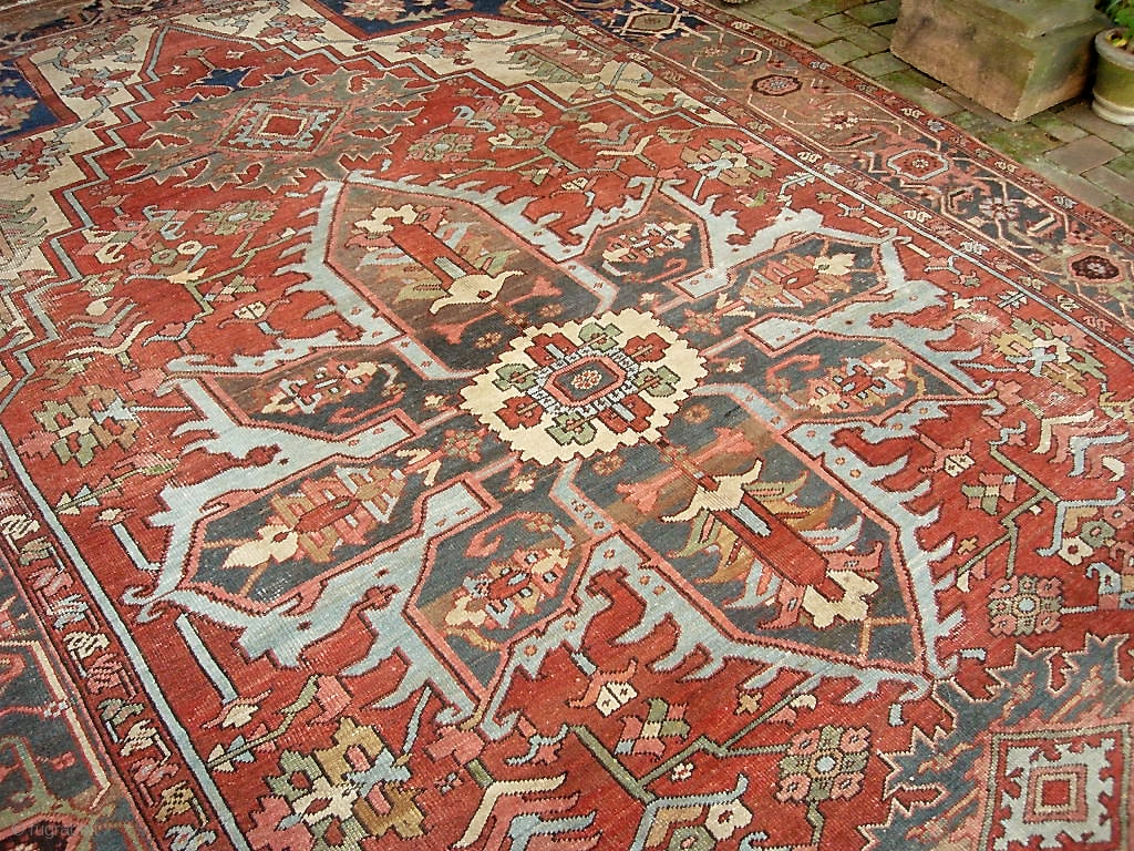 Serapi-- 8 ft 10 in x 12 ft 3 in. a legit antique rug, probably 19th century. It is very open and the medallion is proportionally huge. Very interesting design and colors. There is a small reweave on one corner. Aside from that no one has done anything. Overall not bad condition but there are some low spots that would benefit from some work. Not a lot to be done. i have included a lot of photos so you can see every little thing. Otherwise call me for an in hand condition report. $50 for ups shipping to lower 48.