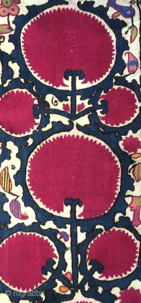 19th cent Uzbek Ura tube region Suzani. It has superb stitches, and veg dyes colours. Excellent adras ikat in the middle, and excellent colours Russian block print back of suzani.