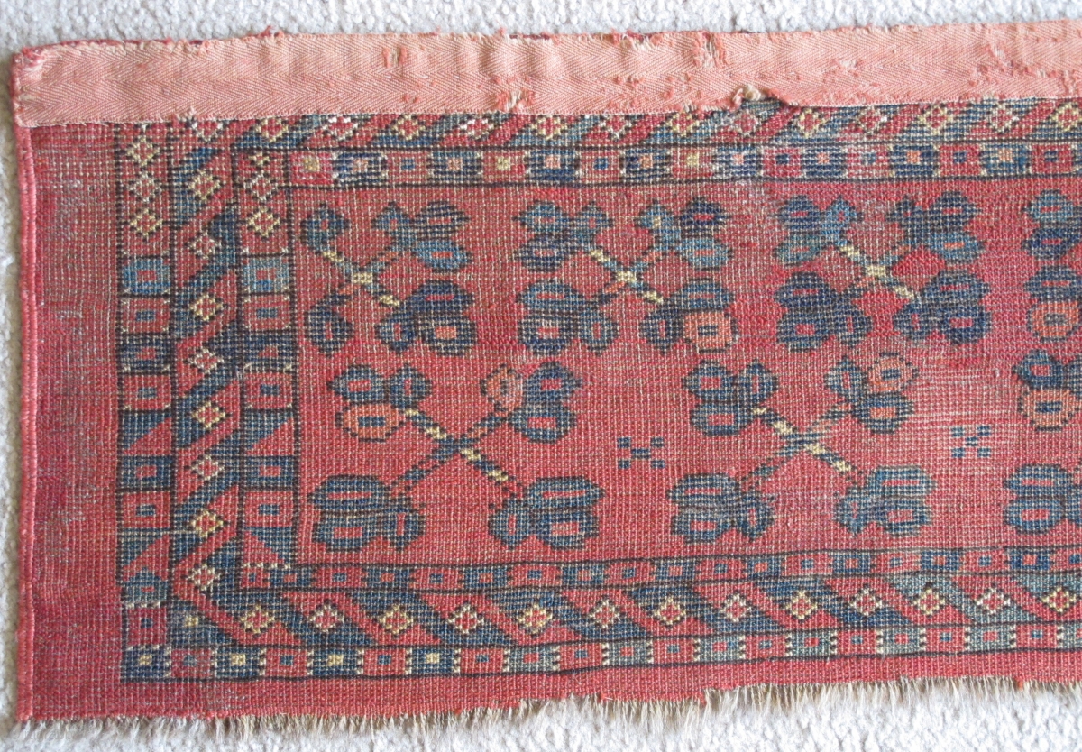 Ersari Trapping, great vibrant madder red. The top row of ornament is drawn on a smaller scale while the bottom is larger-scale spaced more openly. This contrast in composition is further highlighted ever so slightly with abrash. The piece is very presentable. Great wool with a few cotton pile highlights. i wish my camera could capture reds more accurately. The color is really good on this one. There is some minor repair to the sides and an area in the field but it has been done professionally and very competently. size is 130x35cm