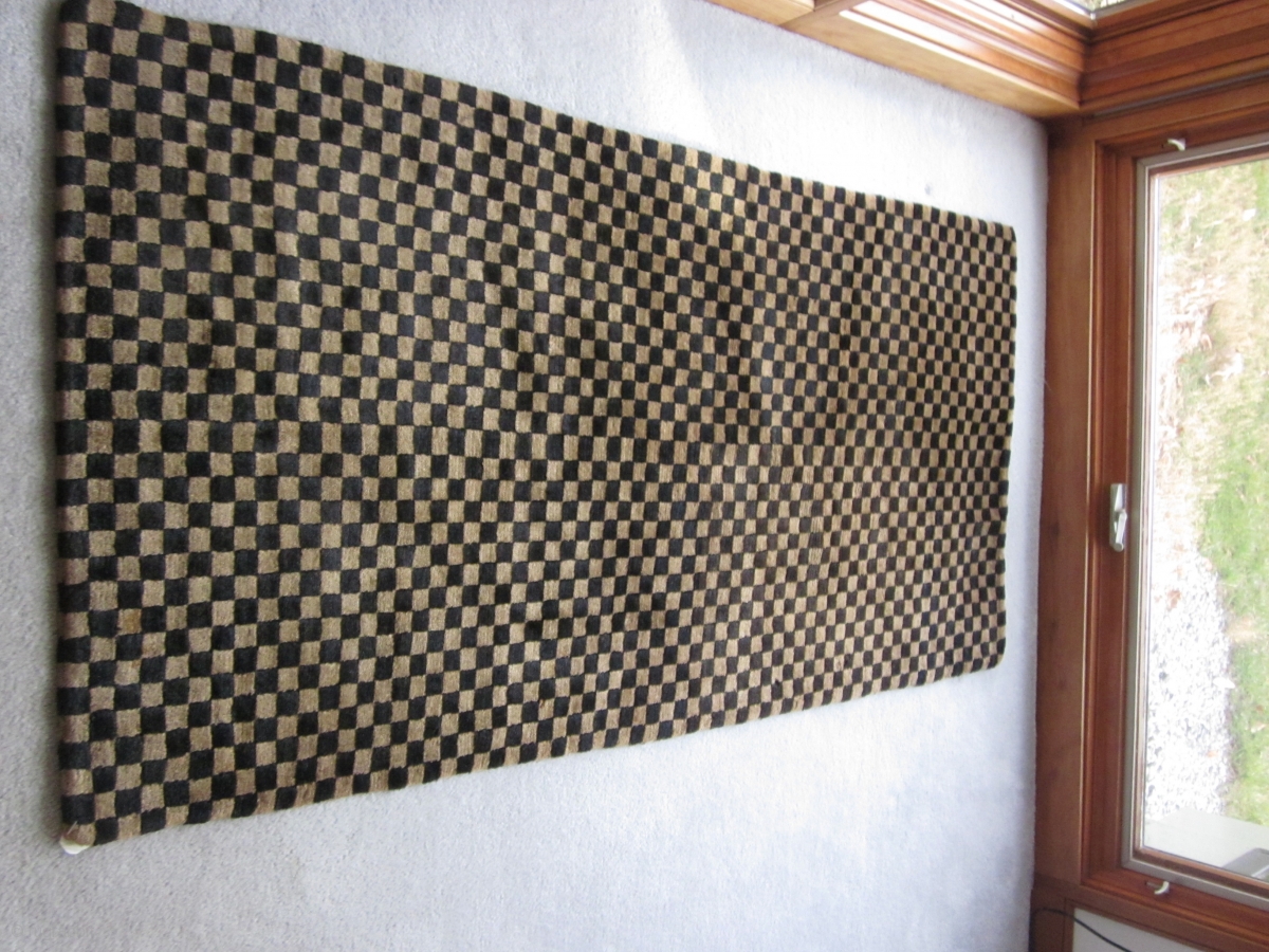 Tibetan classic checkerboard khaden, light brown and dark brown, soft, glossy wool, c.1925 abt 3 by 6 ft. Very good condiiion. sold