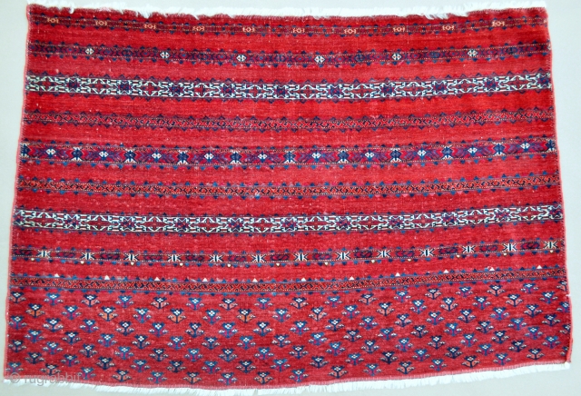 ![Rare finely woven Tekke Chuval, circa 1800 with areas of corrosive red insect dyes, ruby red silk, corrosive white cotton,