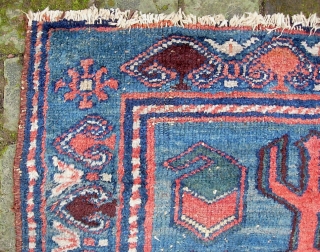 Saveh area. 2 ft 4 in x 3 ft 7 in. Very cool thing. I'm thinking Saveh based on weave and other things. I've been wrong before. It looks like single weft but it actually has two wefts: one cotton; the other dark brown wool. Whatever it is it is unique and interesting. Attrition at the ends and shows some foundation dots mostly on one side in the field. $20 for ups shipping, lower 48.