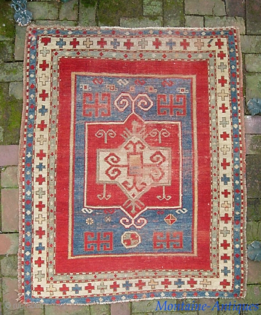Fachralo Kazak. 3 ft 7 in x 4 ft 10 in. a legit ancient piece and God knows how old. Maybe toward mid 19th cent(?) Untouched-- no repairs-- But well traveled. all the condition issues are evident in the photos. $25 for ups shipping, lower 48.