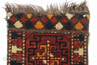 antique liitle pile uzbek or something yastik like object. Coarse weave with long thick pile. Strange palette as shown. Appears to have goat hair warps. Old cloth sleeve sewn on back for hanging. Age? 16" x 45"