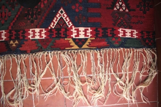 The weaving is very tight and the drawing is superb and superior to both Petsopolous examples. The kilim is peppered with cicim embroidered symbols/motifs and there are twice as many in the right side border than the left. The kilim has had minor professional repairs to one area which lay on the ground when used as curtains which have been made using carefully matched antique wool and photos are also available of the kilim before repair. The kilim complete with its full, and long original fringes (see last photo).