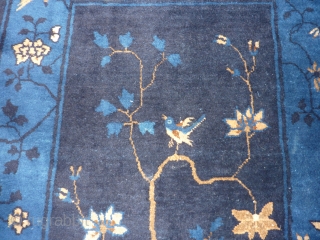 sold__thank you! Pretty Chinese rug 5'8" x 35" in nice condition. Approximately "art deco" age--possibly older? Shiny, high quality wool but looks more dull than it should in my pictures because of an overcast day when taken. Best color photo of the blue is #2: the little bit between the two backside edges--that gives viewer the best idea of how glossy the rug really is.
