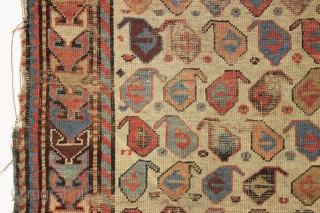 antique akstafa prayer rug. Well drawn older example of the type with excellent natural colors. "As found", very dirty with scattered wear and edge roughness as shown. Priced accordingly. Good age ca. 1860. 3'x 6'1"