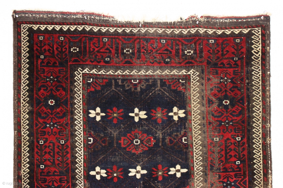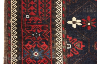 antique baluch rug with mina-hani design field. Characteristic older asymmetric flowers. All good natural colors with a nice ember red. Floppy handle with some scattered wear and heavy brown oxidation. Good age, ca. 1880 or earlier. 4'3" x 7'7"