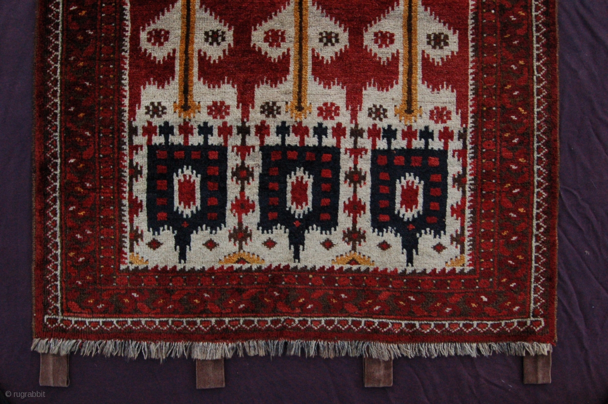 Rare Ikat design Antique Ersari Turkoman prayer rug 110 x 87 cm (3ft 8" x 2ft 11") 1st quarter 20th century. All natural dyes, colours: red, 2nd red, ivory, dark blue, yellow, brown. condition (very) good, medium pile all over (few lower places), original selvedges in excellent state, both headends complete and intact (kilim finishings partly remaining and secured), one small dot of old dry glue (see pics). Technicals: asymmetric knotting open to the right, pile of soft and glossy wool, warps: 2 strands of clockwise twined light grey soft handspun wool, wefts: 2 shoots of handspun brown wool, floppy handle.