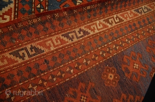 In the Centre you can see three latch hook repating diamond medallions on light blue mainfield with an abrage. the three diamonds are surrounded by small hooked designs!