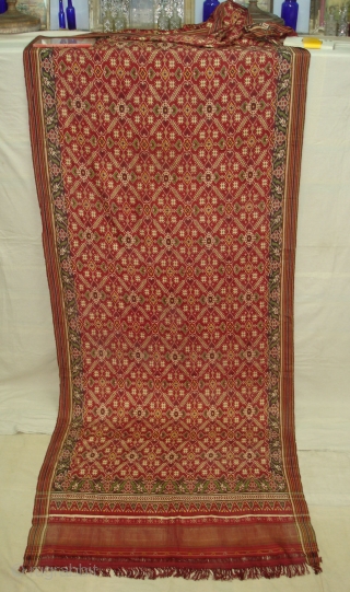 Patola Sari Silk Double ikat.Probably Patan Gujarat.India.19th Century.this Patola sari has the type of geometric,non figurative pattern particularly favoured by the ismaili Muslim merchant community of the Vohras.And its called Vohra-Gaji-Bhat.(Vohra Type Design).Its complex field design of stylized leaves,stars and other motifs is combined with multi-layered and patterns.these include the triangular element called Tumpal.which is particularly associated with South-East-Asian Textiles and with Patola made for export to that area.Its Size is 118cm x 450cm.Condition Is good(DSC03354 New).