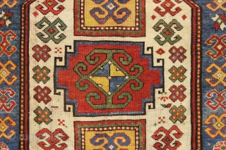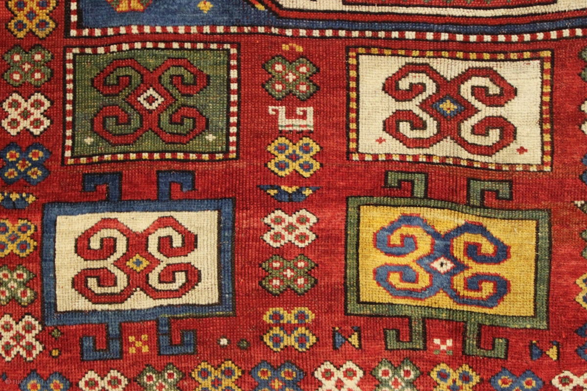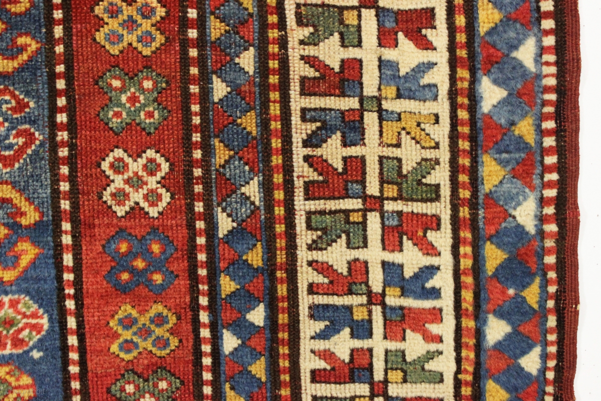 antique unusual karachopf kazak in good condition. Found in a New England barn. Beautiful large caucasian rug with all natural colors. Pretty tomato red ground with lots of light blue, richgreen and great yellow highlights. Interesting design variant with non traditional borders and use of field elements. Overall good pile with light center wear and slight brown oxidation. Original selvages and end braiding. Small spots of repiling. Was very dirty so i had it washed and now ready to go. Lies flat on the floor. late 19th c. 6' x 7'7"
