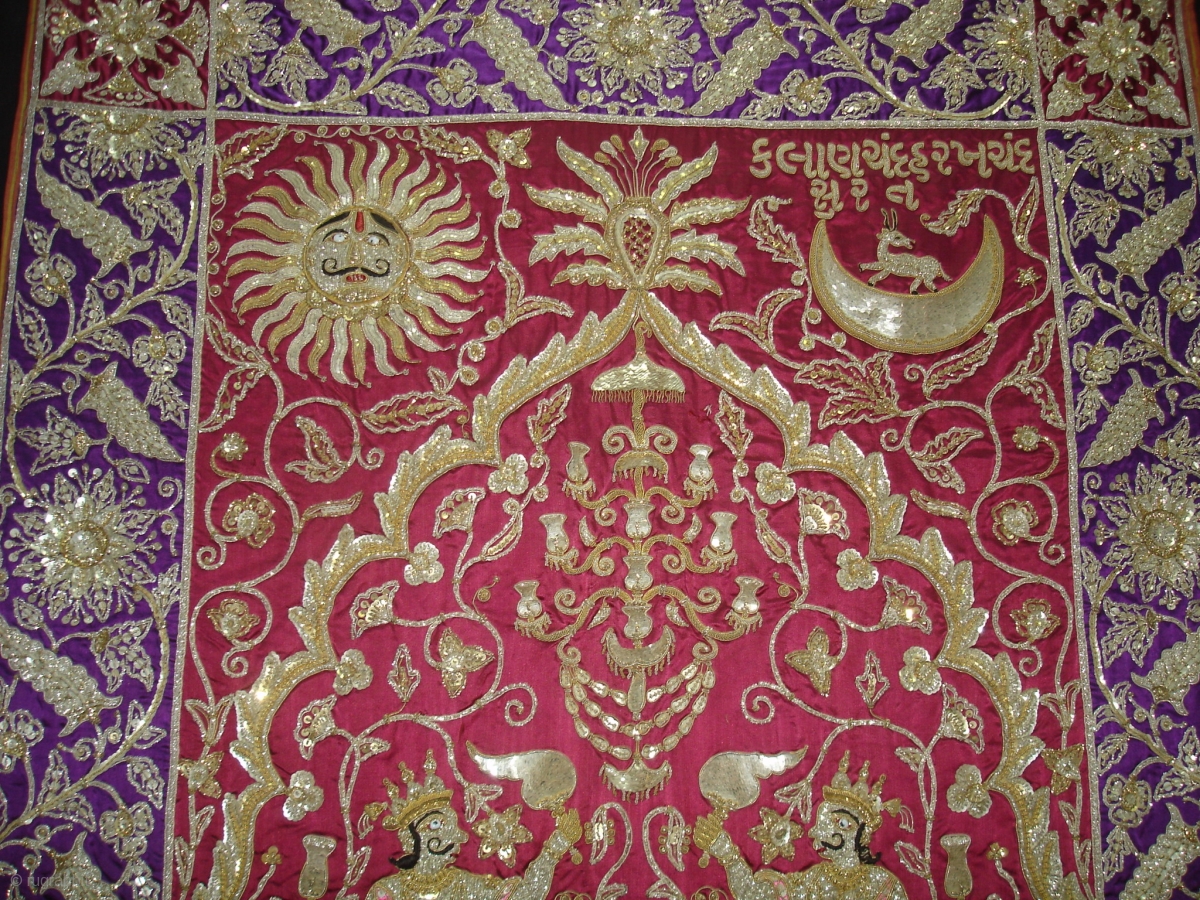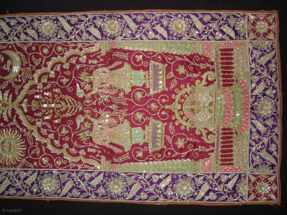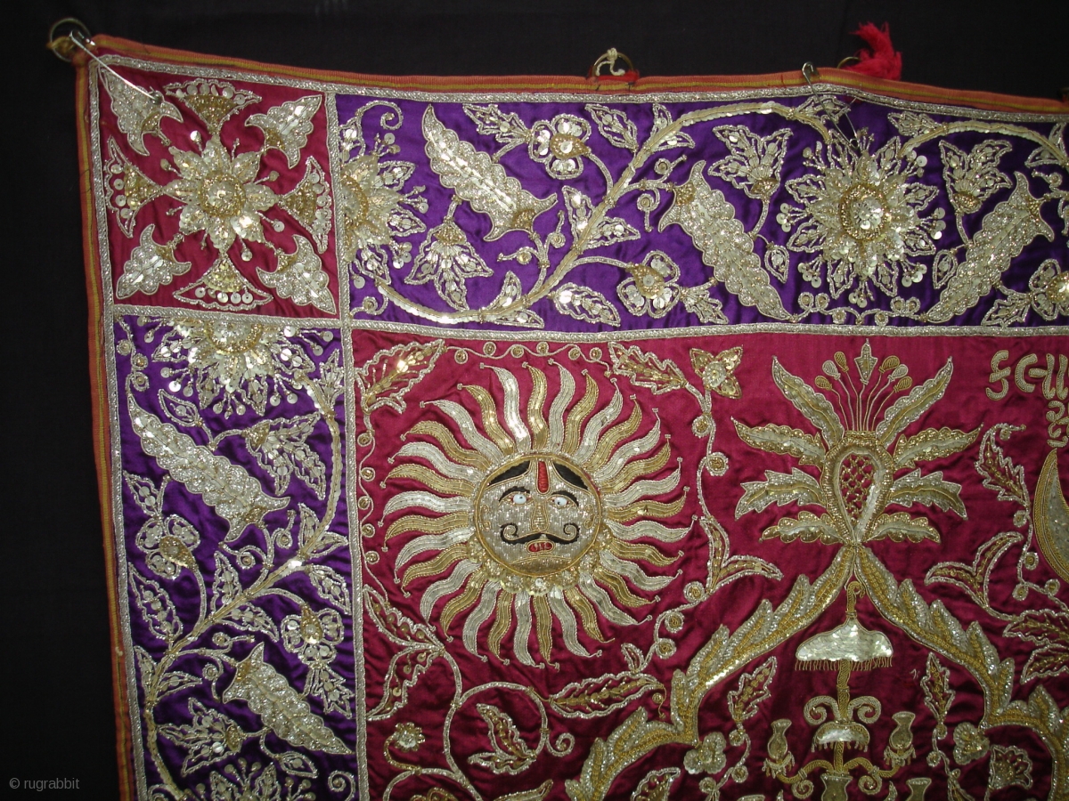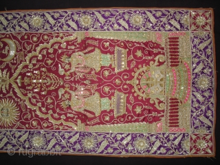 Jain temple hanging,Patan Gujarat,India,19th Century.Gajji-Silk,Silver And gold gilt embroidery.Its size is 82cmX197cm.This an holi temple piece,showing the Jain illustration of Moksha with Ridhi and Sidhi, And sun and the moon.Condition is very good(DSC04043 New).