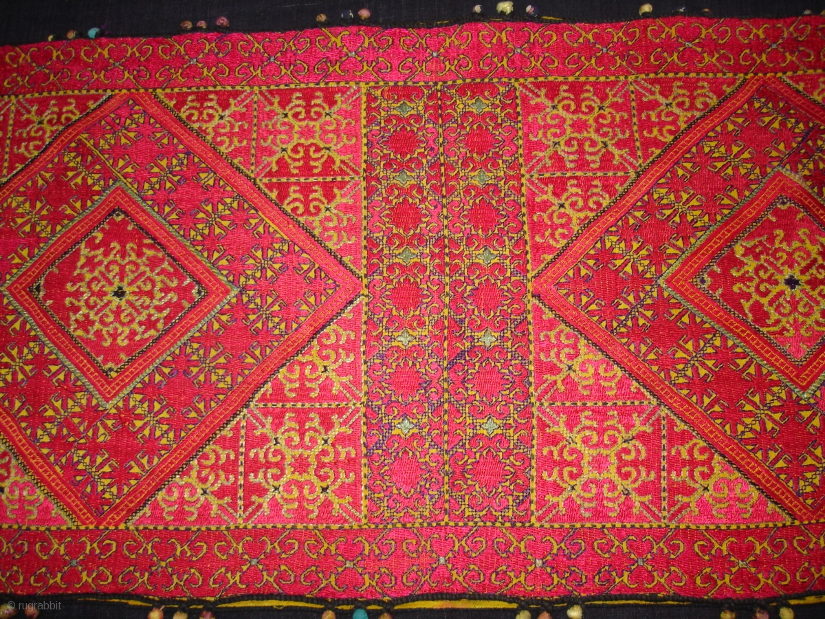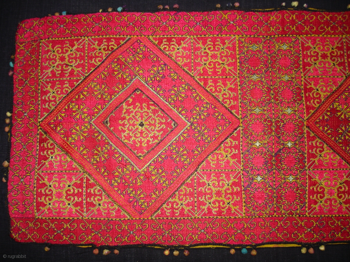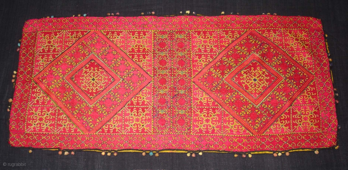 Pillow-Cover,Swat Valley(Pakistan).Cotton embroidered with floss silk.with woollen Braiding and Tassels.Its size is 38cm x 83cm(DSC02786 New).