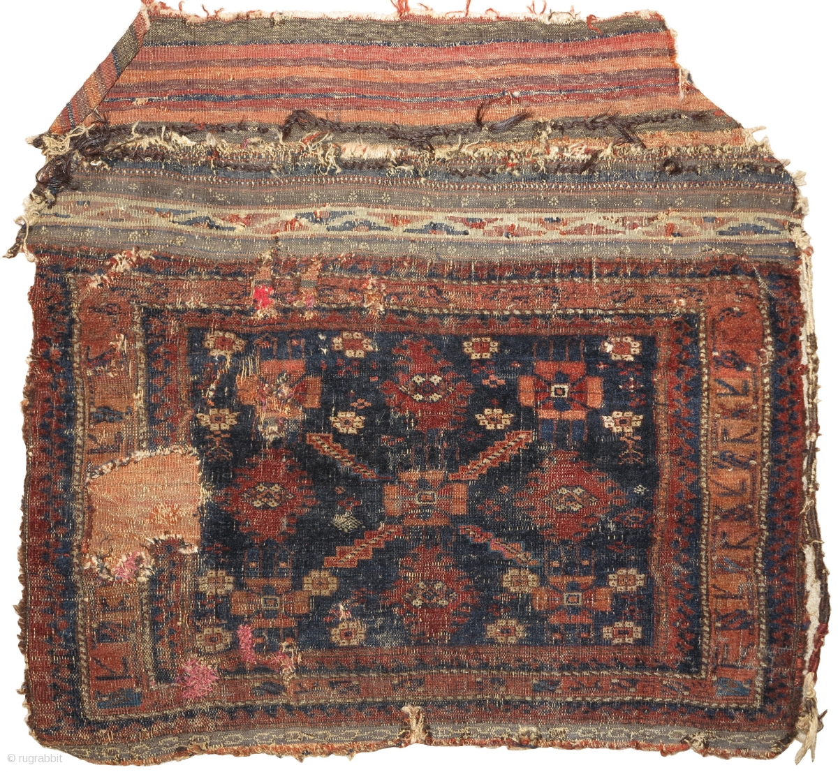 Single-wefted minakhani Baluch bag in paradoxical condition. An old example with several blues, complete back and great flat-woven top but with a lot of damage to the face. The pile face is elongated and measures 32"x!9". The full piece with the kilim folded in place is 32"x30". a piece for the advanced Baluch collector.