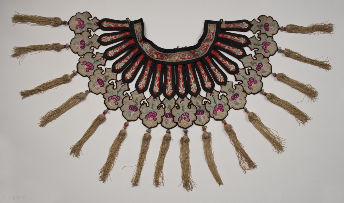 Cloud collar, China. Silk and cotton. 19th - 20th century. 15" (38 cm) from edge of collar to tip of fringe. Neck band is 15.5" (39.4 cm) long. Some areas of fraying on collar, otherwise condition is good. Please see detail photos.