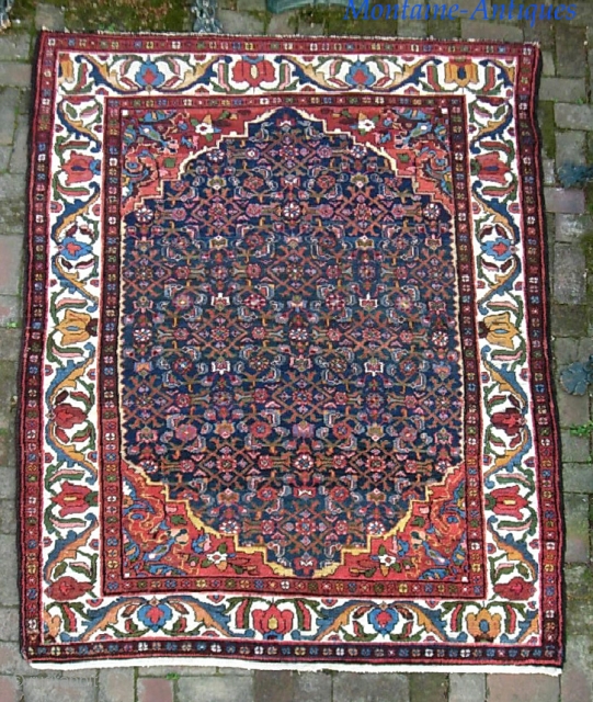 Bahktiari-- 5 ft 1 x 6 ft 10 inches. Lively and decorative with ivory border and lots of different colors. Looks like there is foundation showing in the yellow in one of the end borders. But this is actually just an abrash. Condition is quite good overall $25 ups to Lower 48