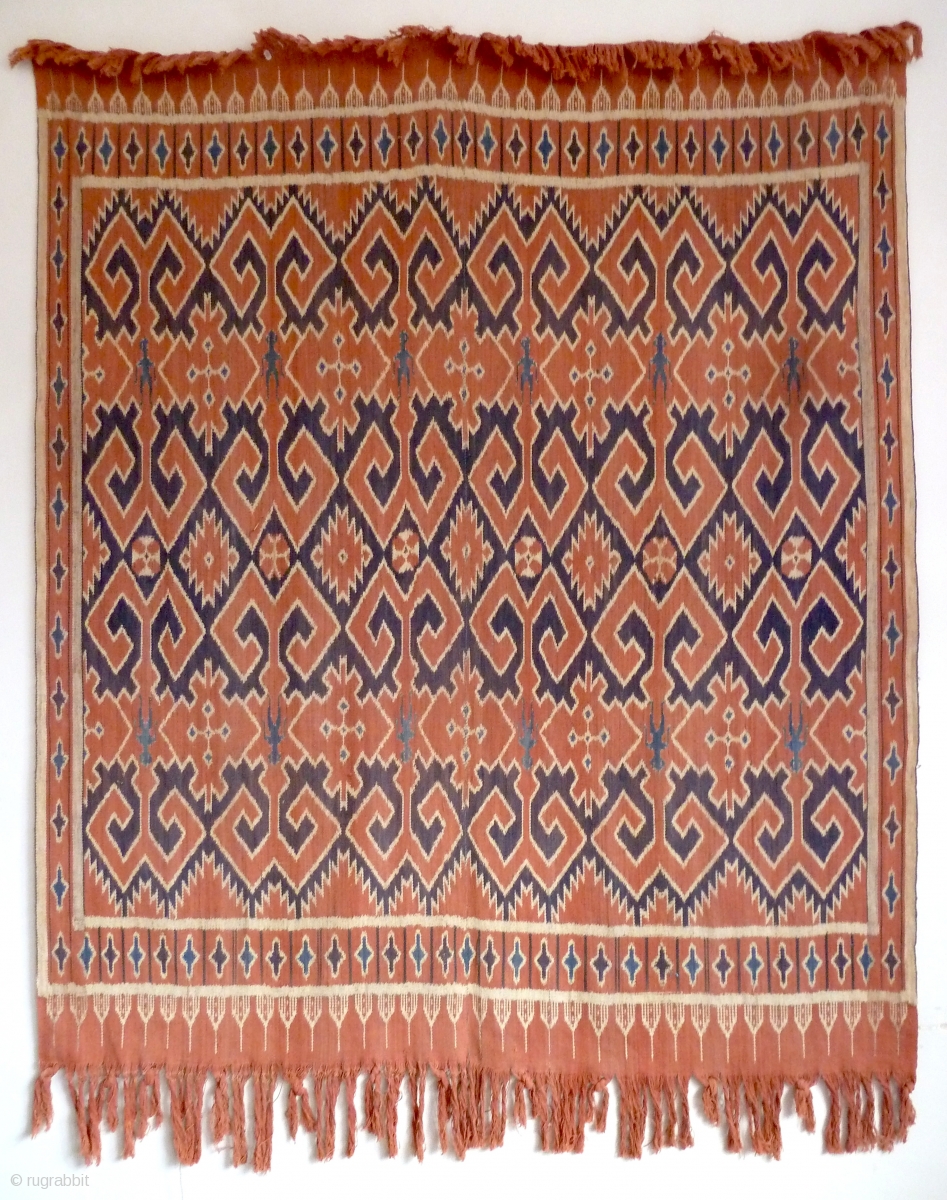 a Toraja Sulawesi ceremonial cloth, joined cotton lengths in warp ikat technique. Indonesia, mid 20th Century. Note the human figures interspersed between the geometric motifs.
