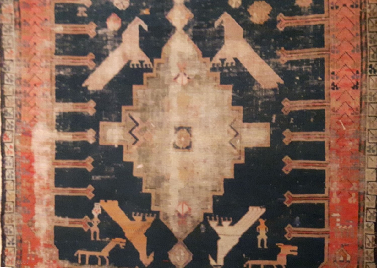 Old Lampa Karabagh long rug 3m x 1.2m with primitive charm. Delightful menagerie of deer, falcons, camels, horses and people. Losses to overbound edges and one small hole. Pile uniformally low. Recently washed. Last two pictures show original colours from the back.