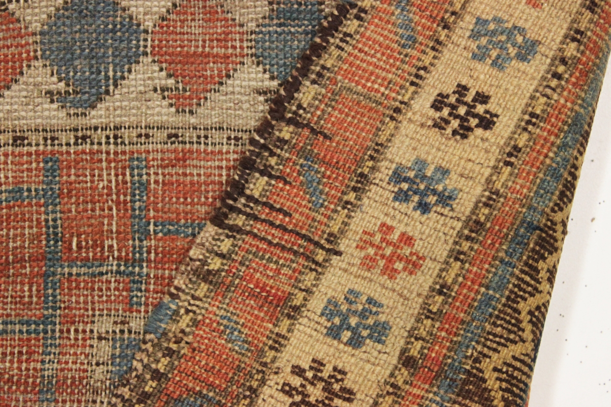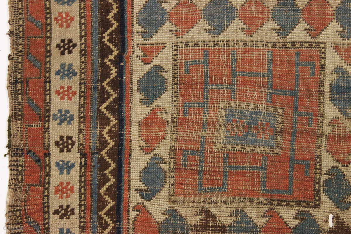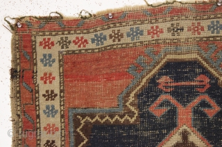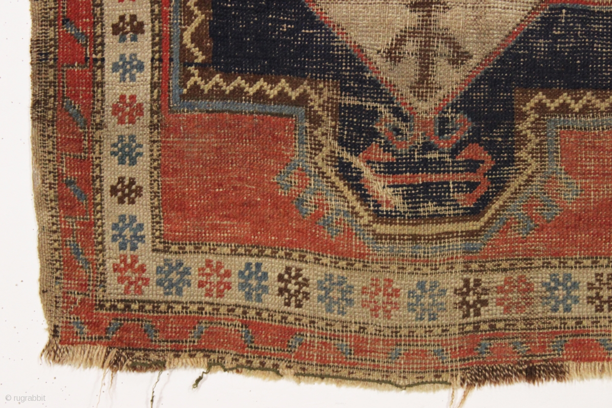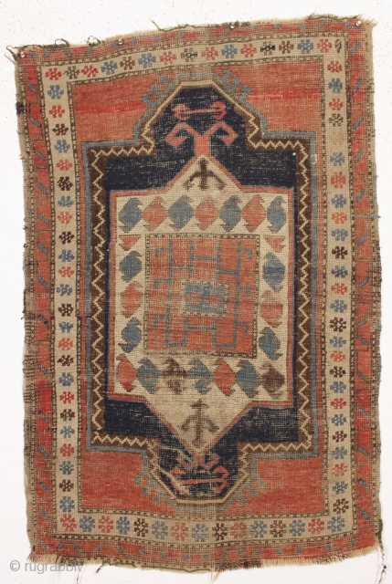 antique caucasian rug. Ghostly archaic little rug. As found, very very dirty. 2'10" x 4'4"
