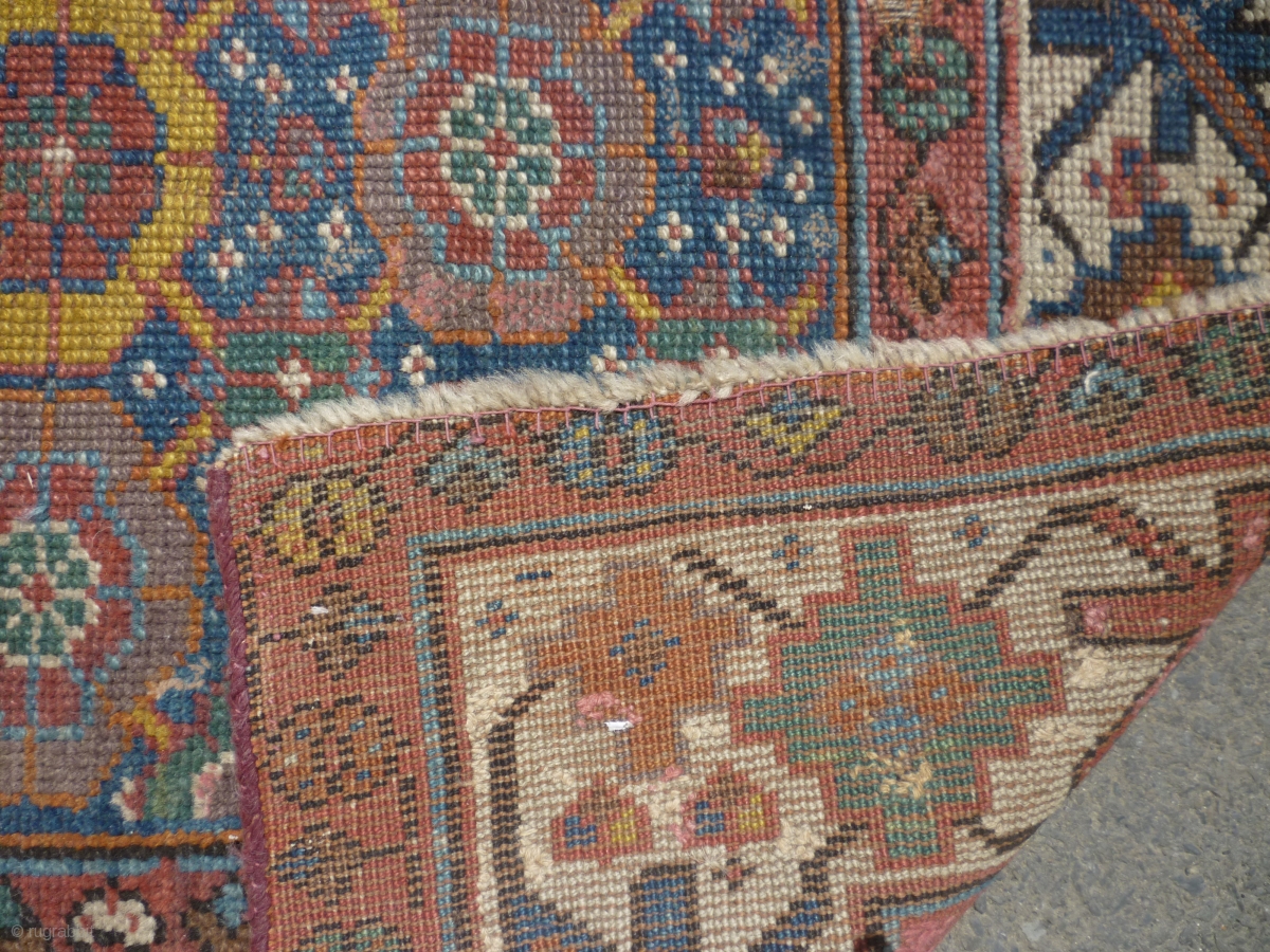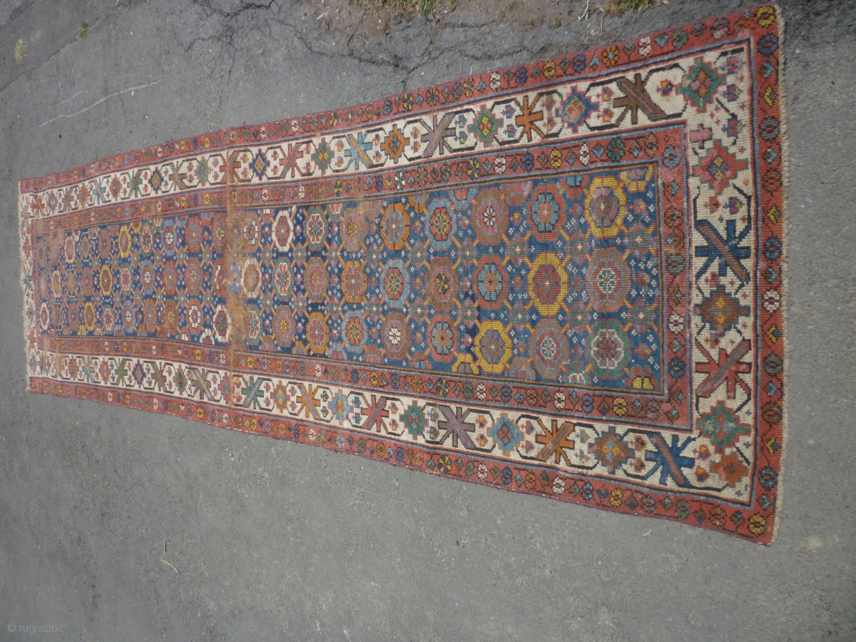 19th century Kurdish/NW Persian runner. Needs a good clean. Edges secured. Bit of a cut at one end. Some wear. Sensibly priced. Photos taken on a very bright day so a little washed out.