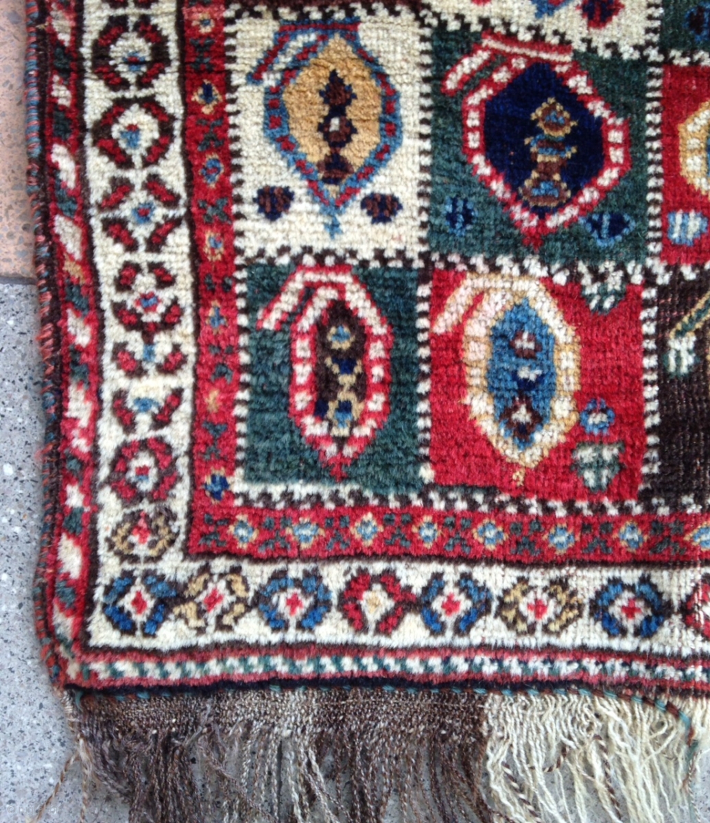 Pretty small Qashqayi rug with variant forms of Boteh in cartouches .