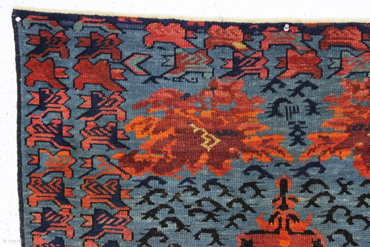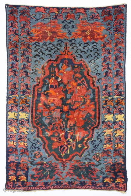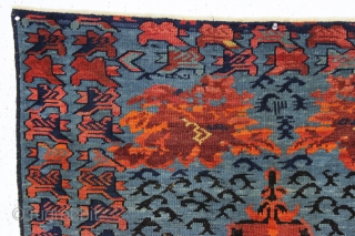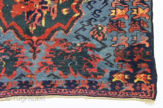 antique seichour rug. Wild and wonderful, a Rorschach test of design. Typical mix of brilliant natural and likely synthetic colors. Overall good condition with good pile. a few tiny spots of black oxidation and a few tiny thumbnail size spots of old attempted poor repiling of oxidized spots. Clean. Fun. Late 19th c. 3'3" x 4'11"