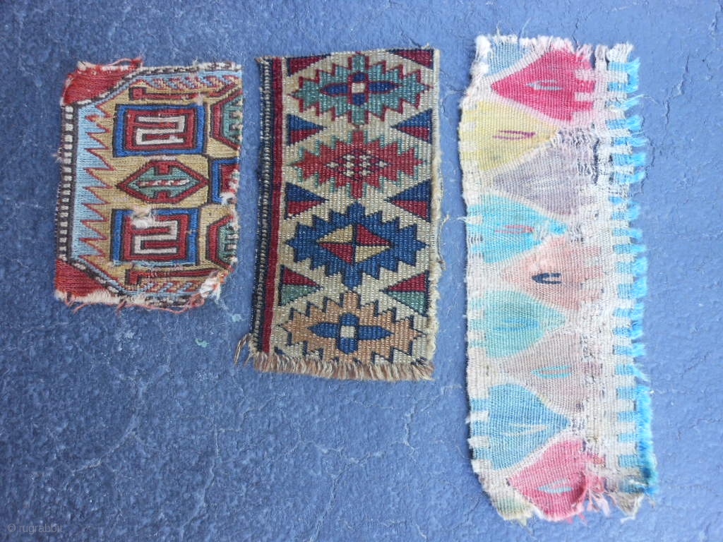 Three 19th century Fragments: Soumac, 6" x 7" (.15 x .18), Kuba border 5" x 10" (.13 x .25), Turkish Kilim, 5" x 12" (.13 x .31), fragments were washed, plus shipping.
