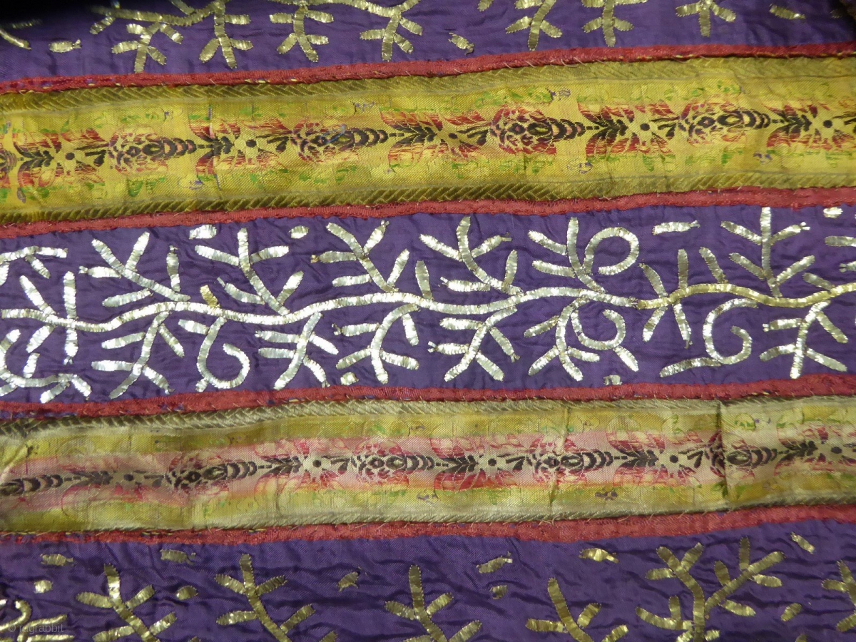 Early Wedding tunisian top Circa 1800/1850 Tunisia Exceptional tunic of wedding embroidery of gold silver and silk ribbon very probably dating from before 1850. Rectangle tunic with open neckline and scalloped Ribbon with gold arm crossing. Alternation of 18th century figured silk ribbons, sewn bands of silk violine twill embroidered with gold and silver flat yarns. Most recent brackets with rings on the back. At its centre band embroidered silver talismanic ancestral grounds, probably much older (17th century?). Good condition except the ribbons of silk. Dimensions: height 124 cm, circumference 188 cm.
