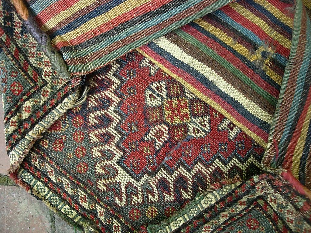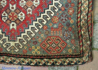 Qashqai-- 19 x 23 in. Really ancient piece in soft colors. Pile is low but even. $15 ups shipping to lower 48.